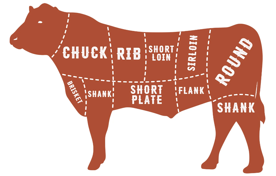 - 60 roasts and cuts (an assortment of round roasts, chuck roasts, tri-tip, ribs, brisket, cross-cut shank, stew meat, etc.)